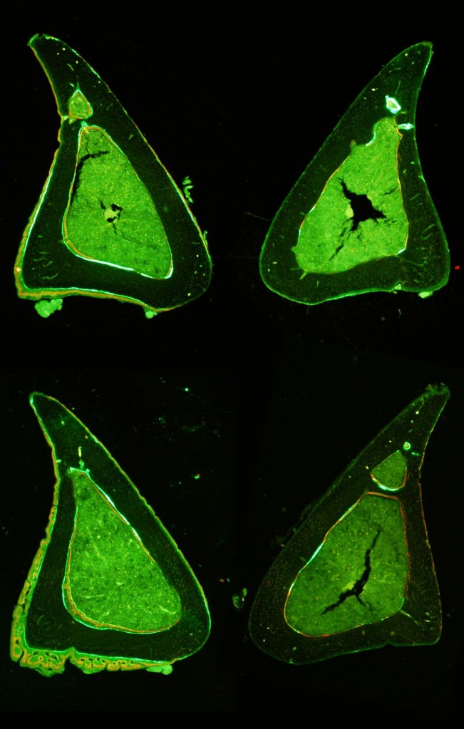 Just as the topology of the cellular network may influence the way that bone cells perceive local tissue strains, so too may formation of this bone cell network be influenced by differences in local strains caused by whole bone loading. To this end, we are investigating the influence of different loading regimes on characteristics of bone cell network topology as a way of determining whether characteristics of this network may be indicative of whole bone loading. Such relationships can be used in comparative models to estimate whole bone loading in fossil and extant taxa as well as in patients afflicted with skeletal wasting diseases to investigate possible causes for malfunction of mechanosensitive mechanisms in the elderly.