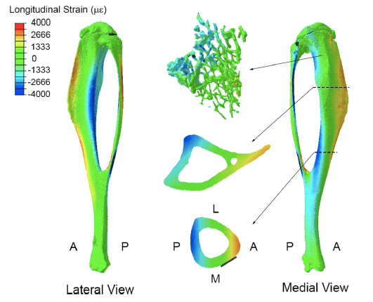 The vertebrate skeleton appears to respond to both increased physiological loads and novel loading regimes. But which bone cells are best suited to sense novel load stimuli – osteoblasts, osteocytes, or some other bone cells? Is the skeleton more sensitive to increased levels of habitual load or completely novel load events? How do the bone cells perceive these different milieu? We utilize mouse in vivo loading models and 3D confocal imaging of the osteocyte lacunar-canalicular network (LCN) to construct whole bone mechanical models to relate to cell-level mechanical stimuli induced by different types of whole-bone loading.